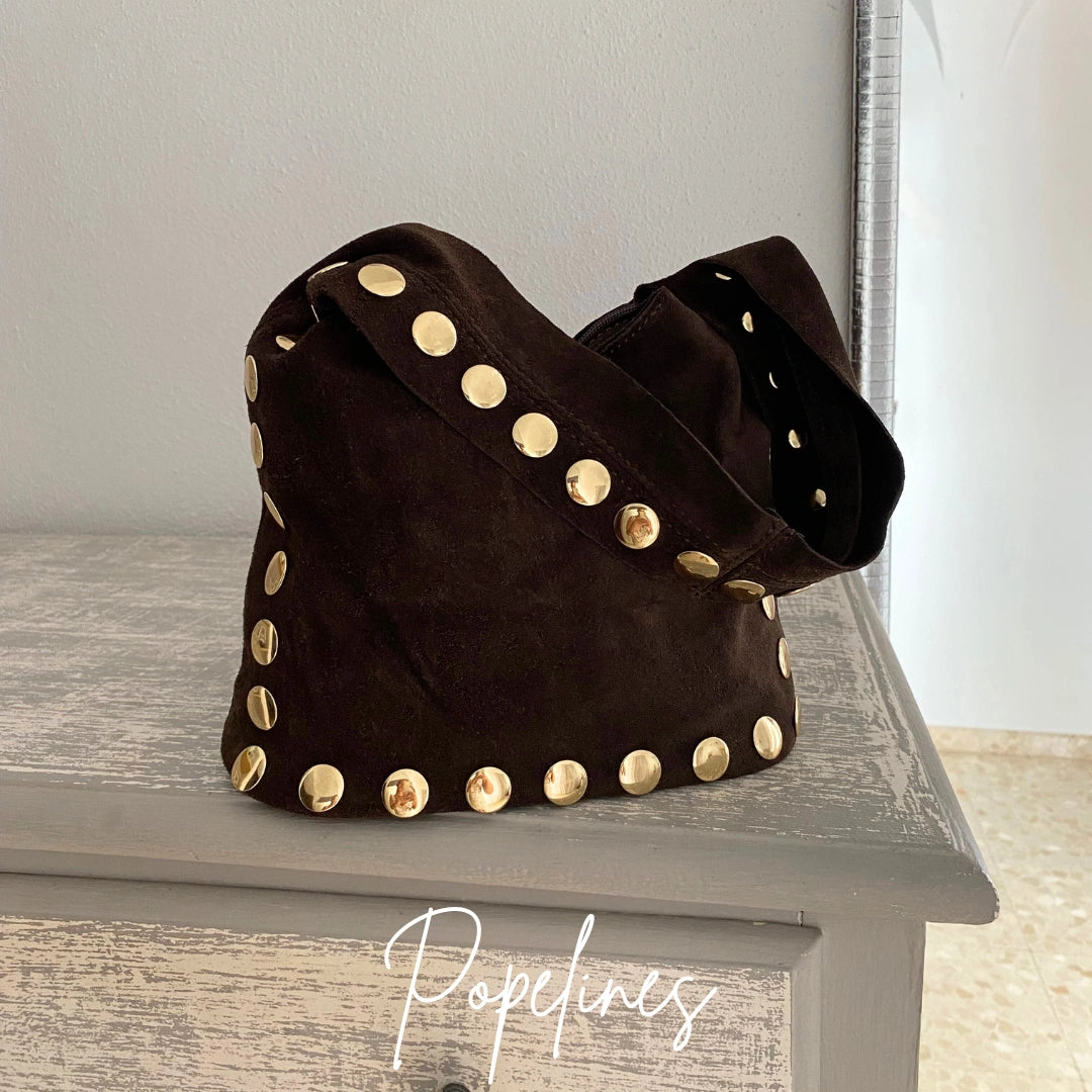 Este bolso en color chocolate con tachuelas doradas es el complemento perfecto para quienes desean destacar con elegancia y personalidad. Su diseño versátil permite combinarlo fácilmente tanto con outfits casuales como con looks más formales, aportando un toque moderno y sofisticado.