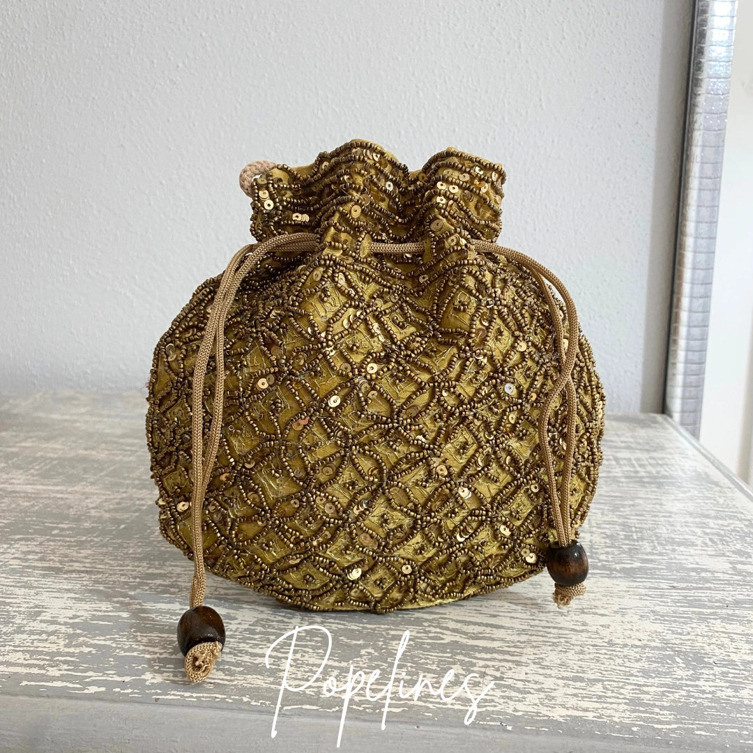 Esta bombonera destaca por su diseño artesanal con cuentas doradas sobre un fondo beige suave, aportando un brillo sutil y sofisticado a tu estilo. Ideal para mujeres que buscan un complemento único y versátil, este bolso se adapta tanto a eventos formales como a salidas informales, elevando cualquier conjunto con su toque elegante.