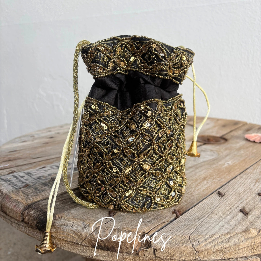 Esta bombonera dorada con detalles de cuentas es el accesorio perfecto para elevar tus conjuntos de fiesta o eventos especiales. Su acabado brillante y los delicados adornos de cuentas aportan un aire glamuroso y femenino, ideal para quienes buscan destacar con estilo y personalidad.